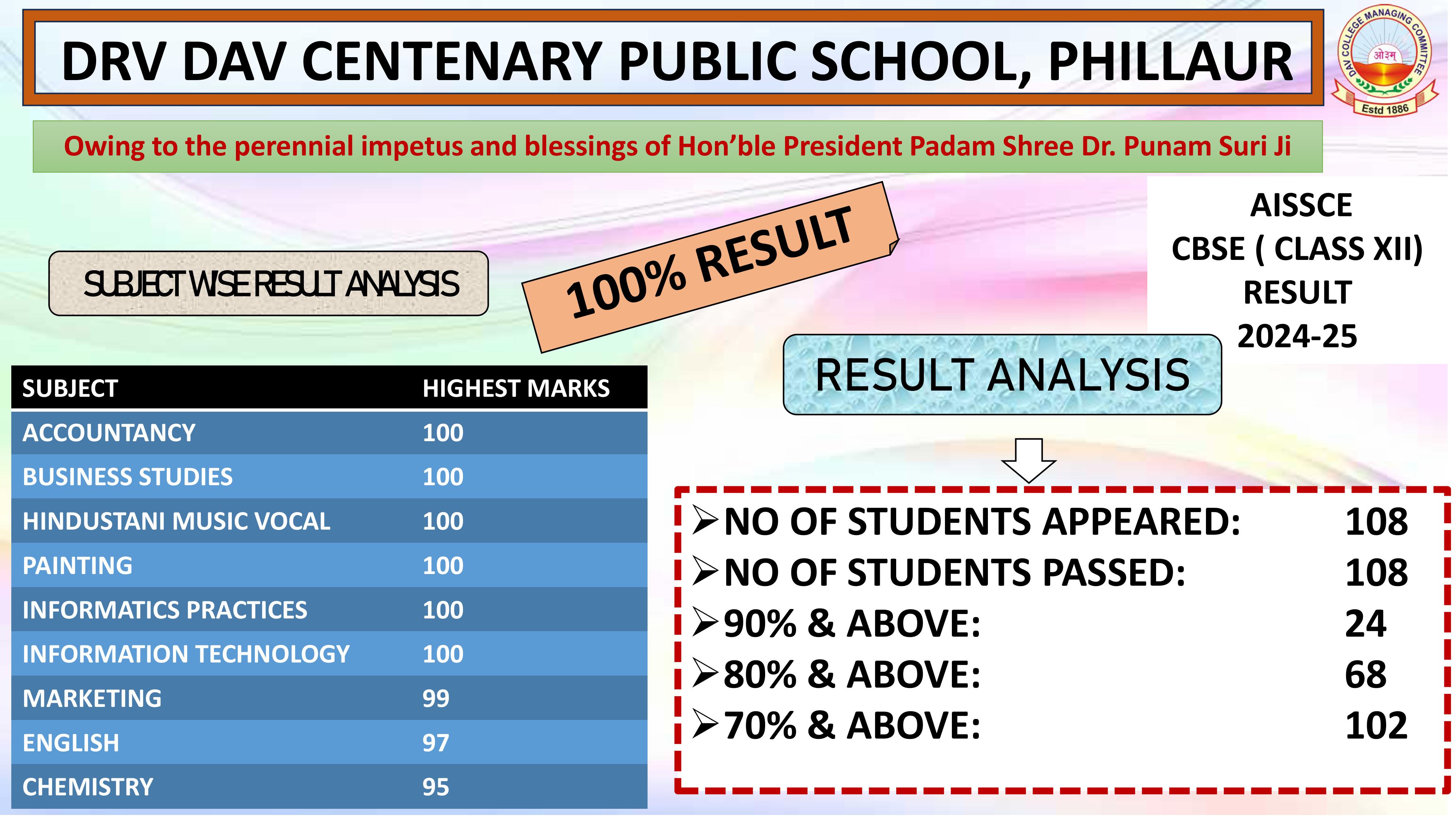 The budding scholars of DRV DAV Centenary Public School, Phillaur proved their mettle by scoring remarkable result in the CBSE XII examination 2014-2015.